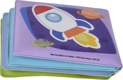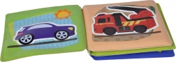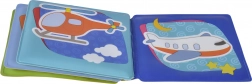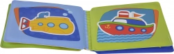 Denne bløde, vaskbare bog med pivelyd er designet til barnets første opdagelser. Takket være det vandtætte design kan børn nyde den i badet, i sandet og derhjemme. De glade illustrationer af biler, toge, skibe og fly hjælper med at udvikle synssansen, ordforråd og finmotorik.