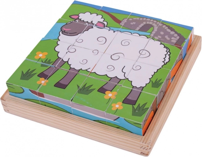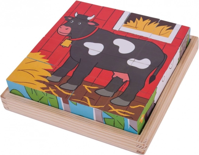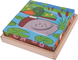 Billedklodser med gårdmotiver vil glæde små byggere og dyreelskere. Af seksten robuste træklodser samler børn seks forskellige scener – det handler blot om at dreje klodserne rigtigt og finde de sider, der passer sammen. Legen styrker på en sjov måde hånd–øje-koordination, logisk tænkning og tålmodighed.