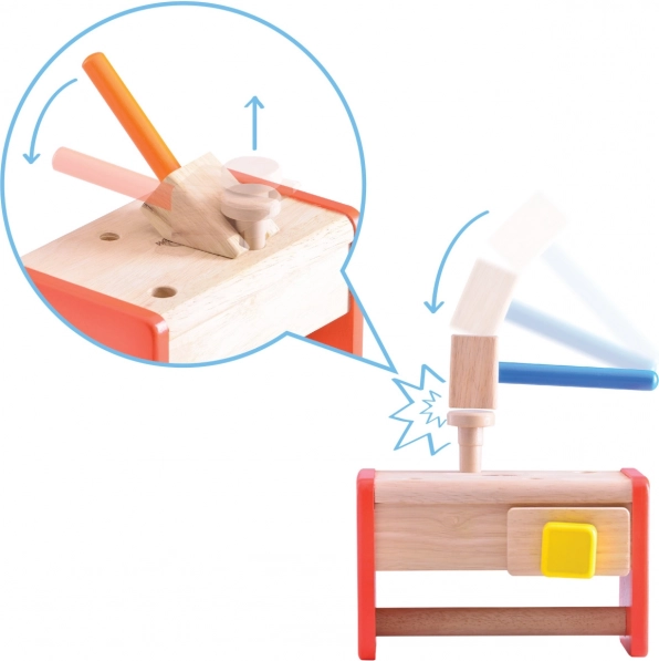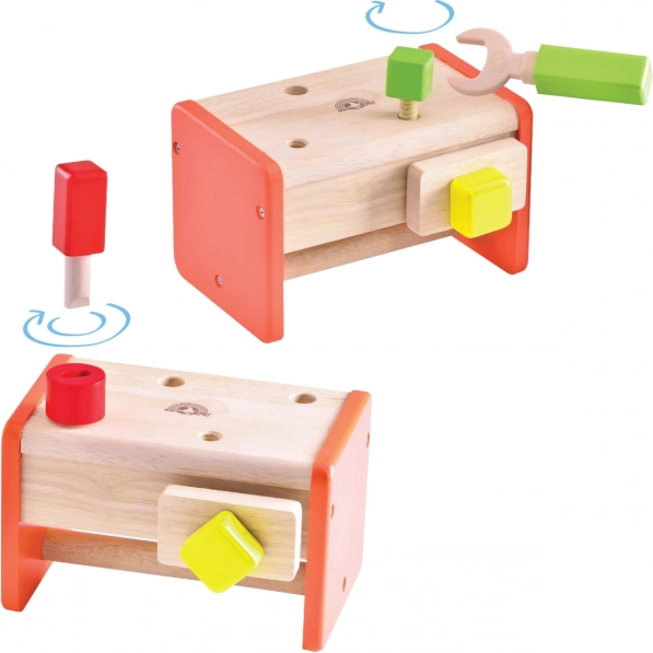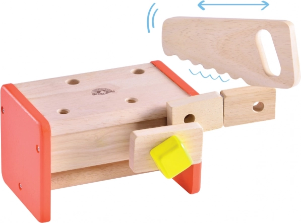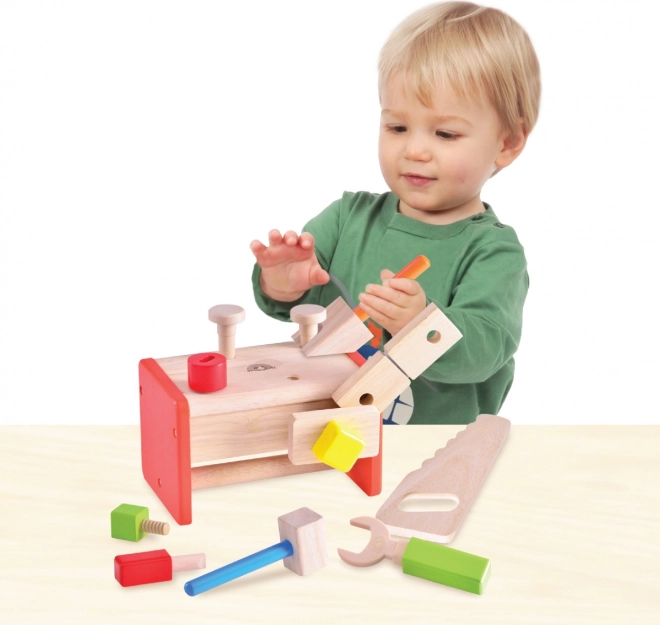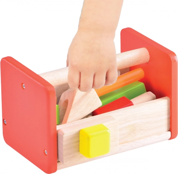 Sættet er fremstillet af holdbart massivt træ og træplast, hvilket sikrer lang levetid og sikker leg. Den attraktive kombination af naturligt udtryk og mættede farver tiltaler ethvert barns øjne. Børn lærer at sortere værktøj efter formål, og den kompakte konstruktion sparer samtidig plads.