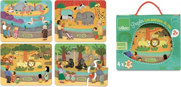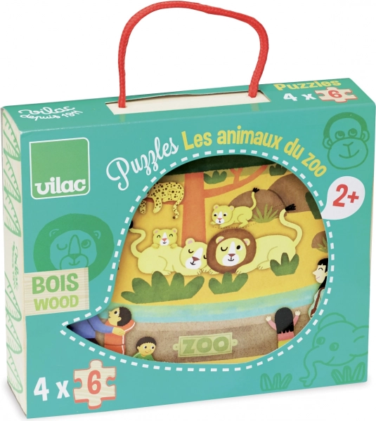 Træpuslespil med ZOO‑motiv giver sjov for børn fra 2 år. Indeholder fire puslespil, hver med seks brikker, og er praktisk opbevaret i en trææske med bomuldshank.