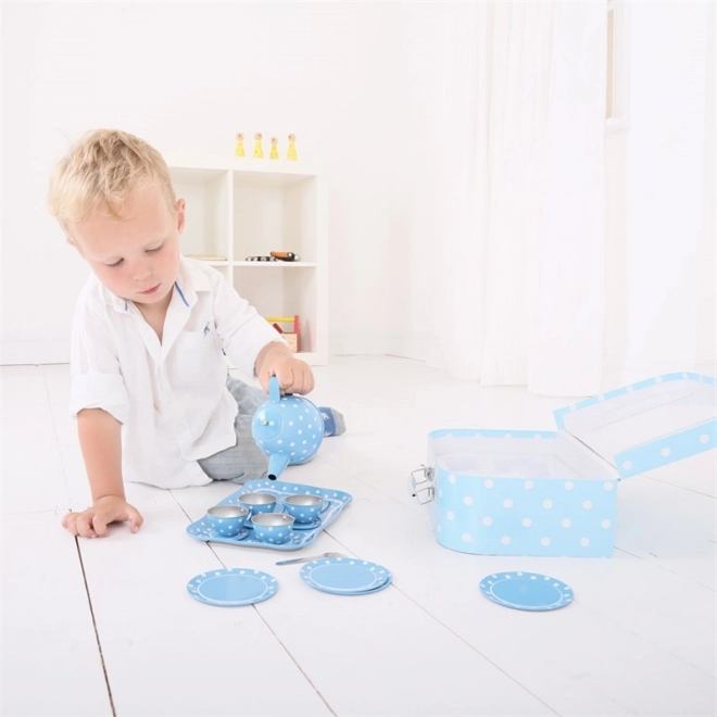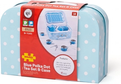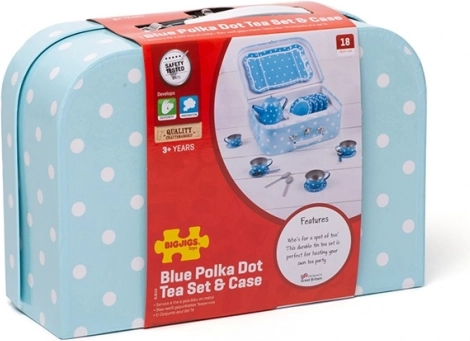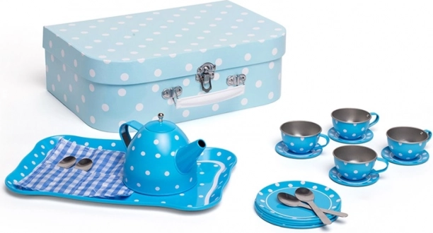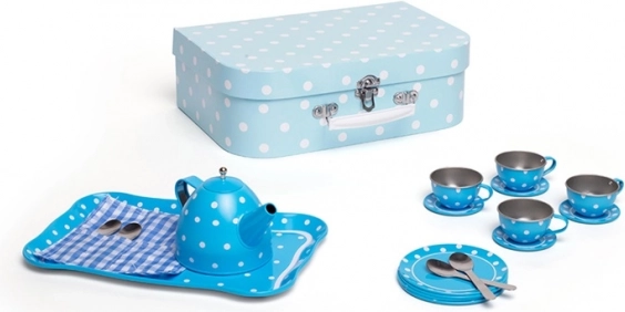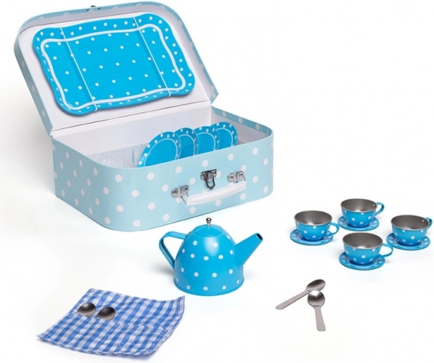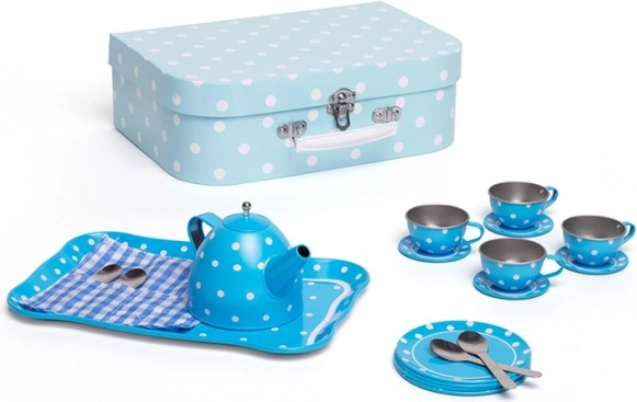 Stilfuldt blåt prikket tesæt i en robust kuffert vil glæde enhver lille vært. Indeholder alt til perfekte børne-"teselskaber" – fra kande til kopper og underkopper. Takket være metaludførelsen er sættet holdbart, let at bære og ideelt til rejser. Legen understøtter kreativitet, fantasi og sociale færdigheder og opfylder europæiske sikkerhedsstandarder.