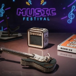 Stilfuldt træpuslespil af en elektrisk guitar med forstærker til fans af både musik og design. Indeholder 140 præcist udskårne dele, lav sværhedsgrad og detaljeret vejledning for en afslappet samling. Ideel som dekoration på bord eller hylde.