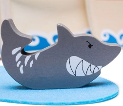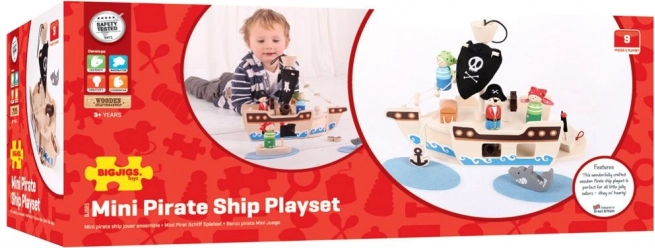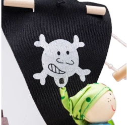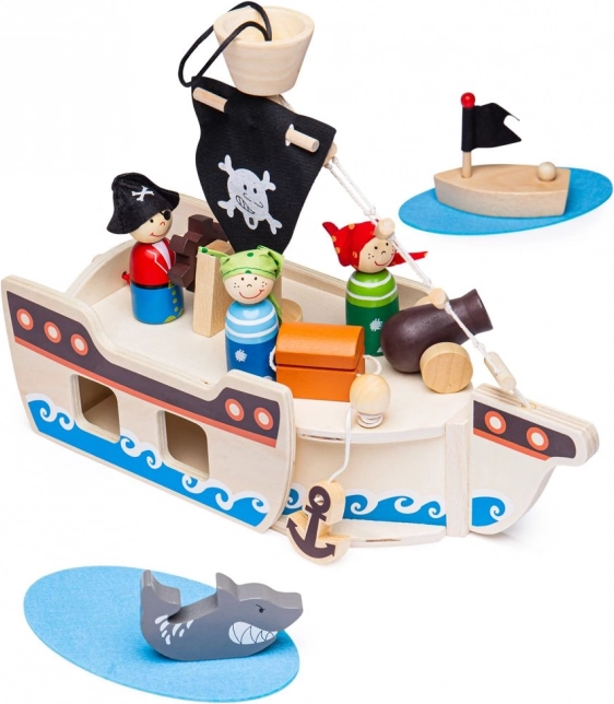 Dette træpiratskibssæt indeholder alt, hvad små pirater har brug for til deres eventyr. Pakken inkluderer kaptajn, to pirater, skib, anker, skattekiste og en haj. Alle spilleelementerne kan nemt placeres i skibet, hvilket gør det ideelt til rejser og nem transport.