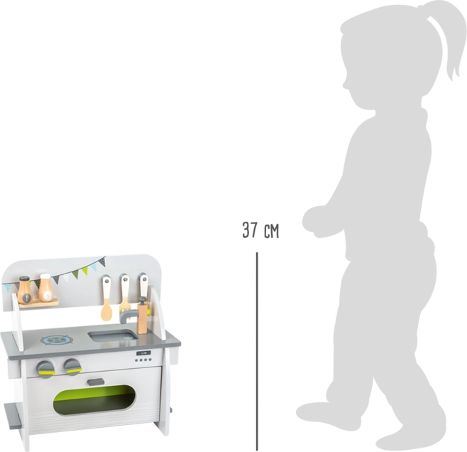 Dette stilfulde og robuste legekøkken i kompakt udgave er ideelt til mindre børneværelser. Det byder på realistiske elementer, der understøtter kreativitet, finmotorik og rolleleg. Drejeknapperne afgiver et behageligt klik ved justering, og de magnetiske ovnlåger er nemme at åbne og lukke.