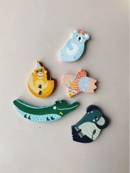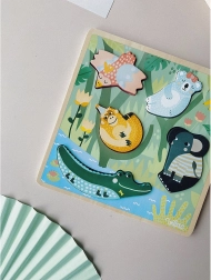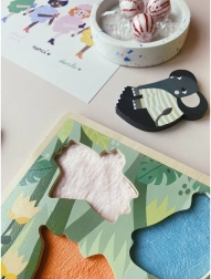 Designet af Michelle Carlslund i blide pastelfarver giver legetøjet et indbydende udtryk og stimulerer fantasien. Træbasen med udskæringer og dyremotiver lærer børn at matche former, genkende farver og dyr. Puslespillet er holdbart, sikkert og fremstillet af kvalitets træ kombineret med tekstil.