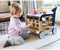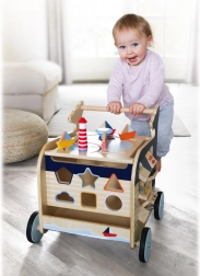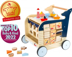 Tag på opdagelse med trægåvognen formet som en hval. Denne gåvogn hjælper ikke kun børn med de første skridt, men giver også forskellige interaktive legetøj til at fremme motoriske færdigheder.