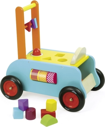 På siderne finder du udskæringer til indsætning af træformer, på venstre side roterende farvede valser, og under ryglænet farvede roterende trekanter. Sædefladen er udstyret med et horn med lydeffekter, som underholder børn og motiverer til yderligere opdagelser. Takket være den lave sædehøjde er vognen behagelig også for mindre børn.