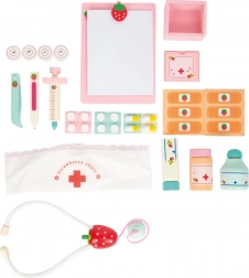 Dette kvalitets doktorsæt i træ, Small Foot Isabel, er ideelt til børns rollelege. Sættet indeholder 24 stykker tilbehør inklusive et tekstilt pandebånd med rødt kors og farverige lægeredskaber med jordbærmotiv, som vil glæde ethvert barn.