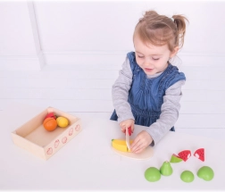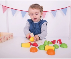 Dette omhyggeligt fremstillede sæt indeholder populære frugter – æble, pære, appelsin, citron, jordbær, banan og melon – sammen med en trækniv og et skærebræt. De enkelte frugter er opdelt i stykker, som sikkert kan adskilles og samles igen, når der 'skæres'. Kvalitetstræ, glatte kanter og robust udførelse sikrer behagelig og sikker leg.