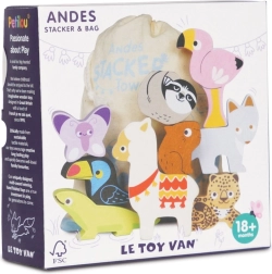 Dette andinske stablingstårn bringer bjergenes eventyr direkte ind på børneværelset. Sættet rummer robuste træfigurer af dyr (fx lama, flamingo, tukan, firben, sommerfugl, dovendyr) samt et bjergstykke, der kan stables, balanceres og kombineres i sjove opstillinger.
