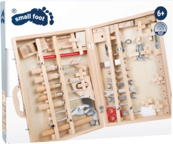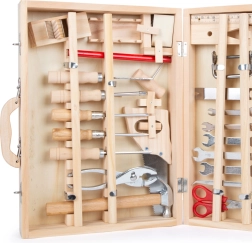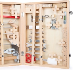 I kufferten finder du alt, hvad der behøves til små hjemmeprojekter og rollelege som håndværker: nøgler, skruetrækkere, sav, saks, mejsel, tømrerblyant, unbrakonøgle, hammer og andre tilbehør. Det 48-delte sæt understøtter finmotorik, koncentration og kreativitet.