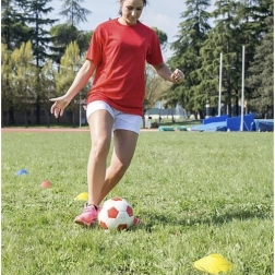 Sættet med lavprofils træningskegler er ideelt til fodbold, atletik, fitness og idræt i skolen. De fem mættede farver (gul, orange, rød, grøn, blå) gør det muligt tydeligt at afmærke zoner, baner og øvelsesstationer, hvilket øger sikkerheden og overblikket under træning.