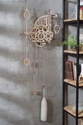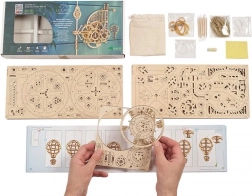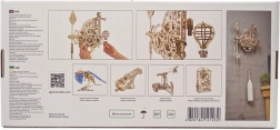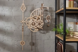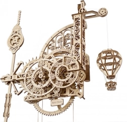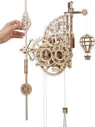 Ugears Aero er et mekanisk vægur i kvalitetsfinér, som du samler selv uden lim. Den fascinerende udsigt til det blottede urværk med pendul og lod giver en enestående oplevelse af præcisionsingeniørkunst. Du aflæser tiden på to urskiver, der roterer mod urets retning, mens den dekorative model af en varmluftsballon stiger jævnt og hver hele time markeres med et lille fald.