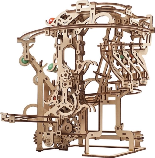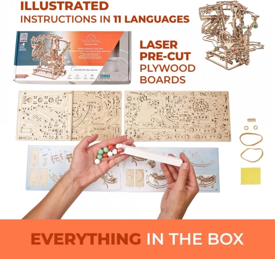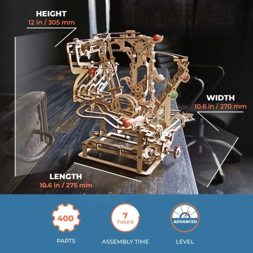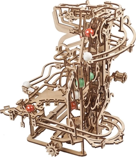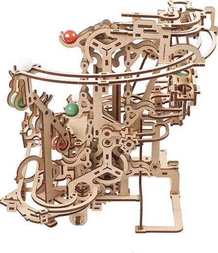 Denne gennemførte kuglebane i kvalitetsfinér kombinerer modelbyggerglæde, læringsværdi og afslappende underholdning. Den manueltdrevne kædelift transporterer kuglerne jævnt til start, hvorfra de fortsætter gennem tre separate sektioner, hver med en unik hovedforhindring. Det åbne design fremhæver funktionsmekanikken og de fine detaljer.