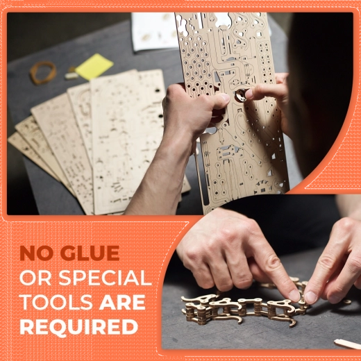 Samlingen er præcis og underholdende takket være 400 præcisionsudskårne dele og en detaljeret vejledning. Modellen giver mulighed for modulær sammenkobling – forbind to til fire baner og skab et synkroniseret mekanisk setup fuld af dynamik og venskabelig konkurrence.