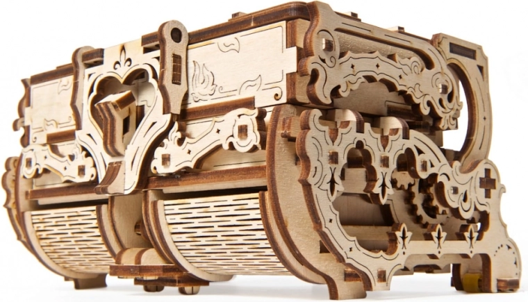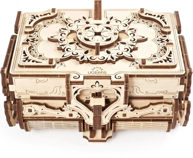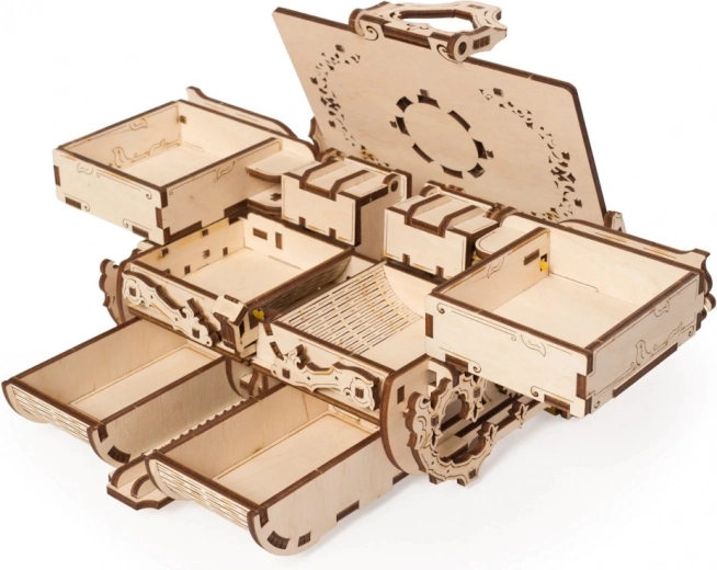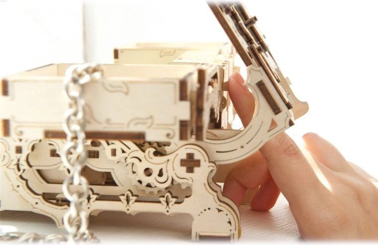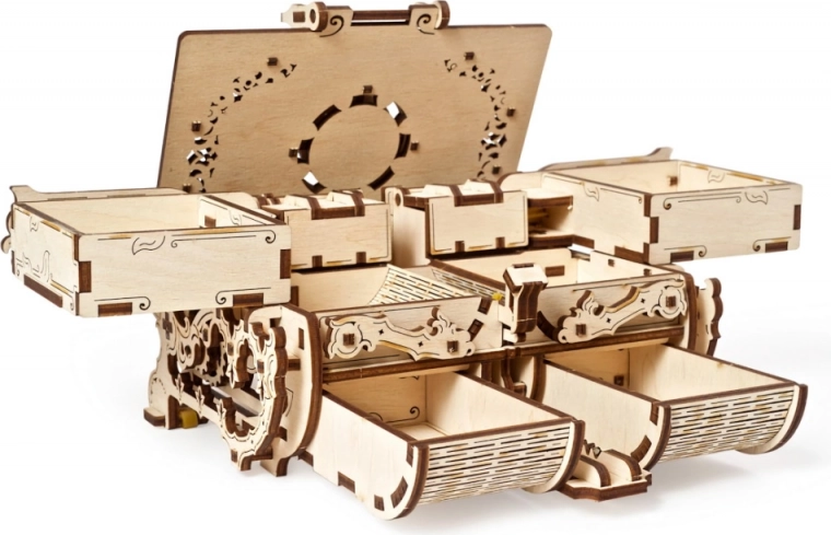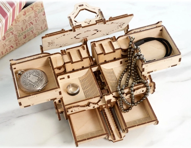 Dette originale smykkeskrin i antik stil kombinerer præcis laserudskæring med smart mekanik. Når det er samlet, får du en funktionel boks med gear og bevægelige dele, der imponerer ved første øjekast og opbevarer dine værdier sikkert. Byggeoplevelsen er både sjov og lærerig – helt uden lim, kun med præcist tilpassede dele i kvalitets træ-krydsfiner.