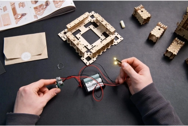 Sættet indeholder 340 præcist udskårne trædele og en detaljeret vejledning. Samlingen klares også af øvede begyndere, men giver samtidig udfordring til de erfarne. Strømforsyning kan vælges via USB‑C eller 3× AA (medfølger ikke), så modellen nemt passer ind i ethvert rum.
