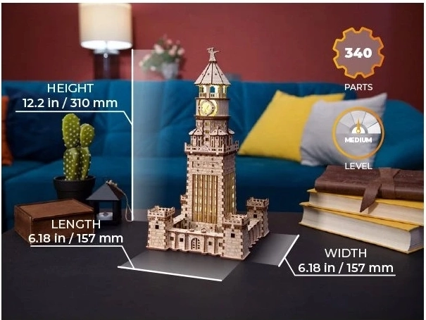 Byg det berømte Alexandrinske fyrtårn som både stilfuld dekoration og smart STEM-byggesæt. Den træbaserede model har præcise detaljer, bevægelige porte og integrerede LED-lys, som skaber en imponerende atmosfære i dit interiør. Samlingen har mellem sværhedsgrad, delene er præcist laserskåret, og modellen kan forsynes med strøm via USB‑C eller 3× AA‑batterier (medfølger ikke). En ideel gave til fans af historie, modeller og kloge legetøj.