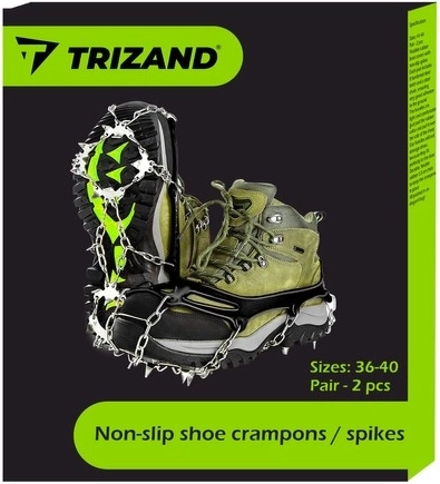 TRIZAND skridsikre overtræk er det ideelle valg til vintervandring, byvandring og ture i naturen. Hvert overtræk er udstyret med 8 stålpigge forbundet med rustfrie kæder, som øger stabiliteten på isede eller våde overflader. Holdbare materialer og gennemtænkt konstruktion beskytter skoene og sikrer lang levetid.