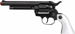 Kovboyrevolver – metal, sort til kapsler – tolv skud. Størrelse på revolveren: 24,5 × 11 cm. Fremstillet i Spanien.