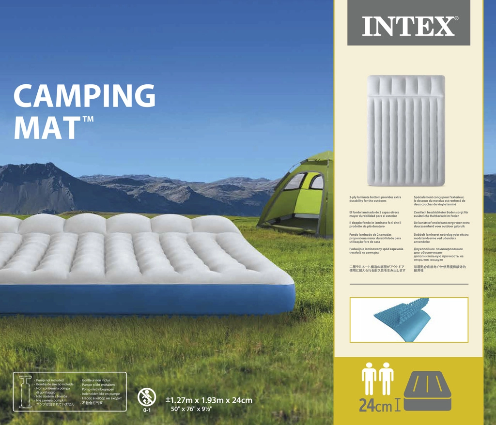 Denne oppustelige madras med målene 127 × 193 × 24 cm giver et stabilt og komfortabelt underlag på ture, festivaler og derhjemme til uventede gæster. Den profilerede overflade fordeler vægten jævnt og øger komforten, mens den forhøjede højde på 24 cm forbedrer isoleringen fra den kolde jord.