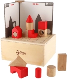 Sættet er designet til børn fra 3 år, og alle stykker er sikkert opbevaret i en trækasse med dimensioner på 18,5 x 16 x 9 cm. Børn kan prøve at samle klodserne efter kortene og matche begge sider, hvilket træner deres logik og færdigheder.