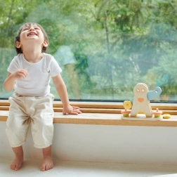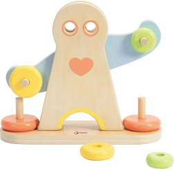 Børn flytter ringe langs figurens arme og ser, hvordan balancen ændrer sig. På en naturlig måde forstår de forskellen på let og tungt og øver logisk tænkning.