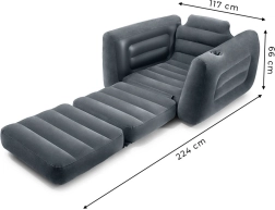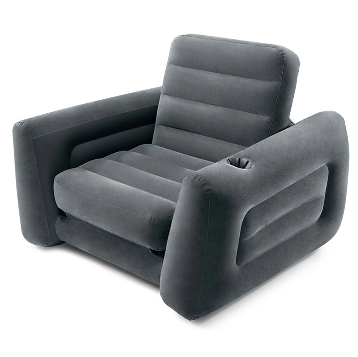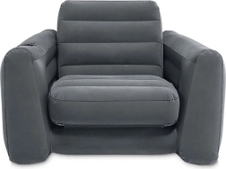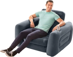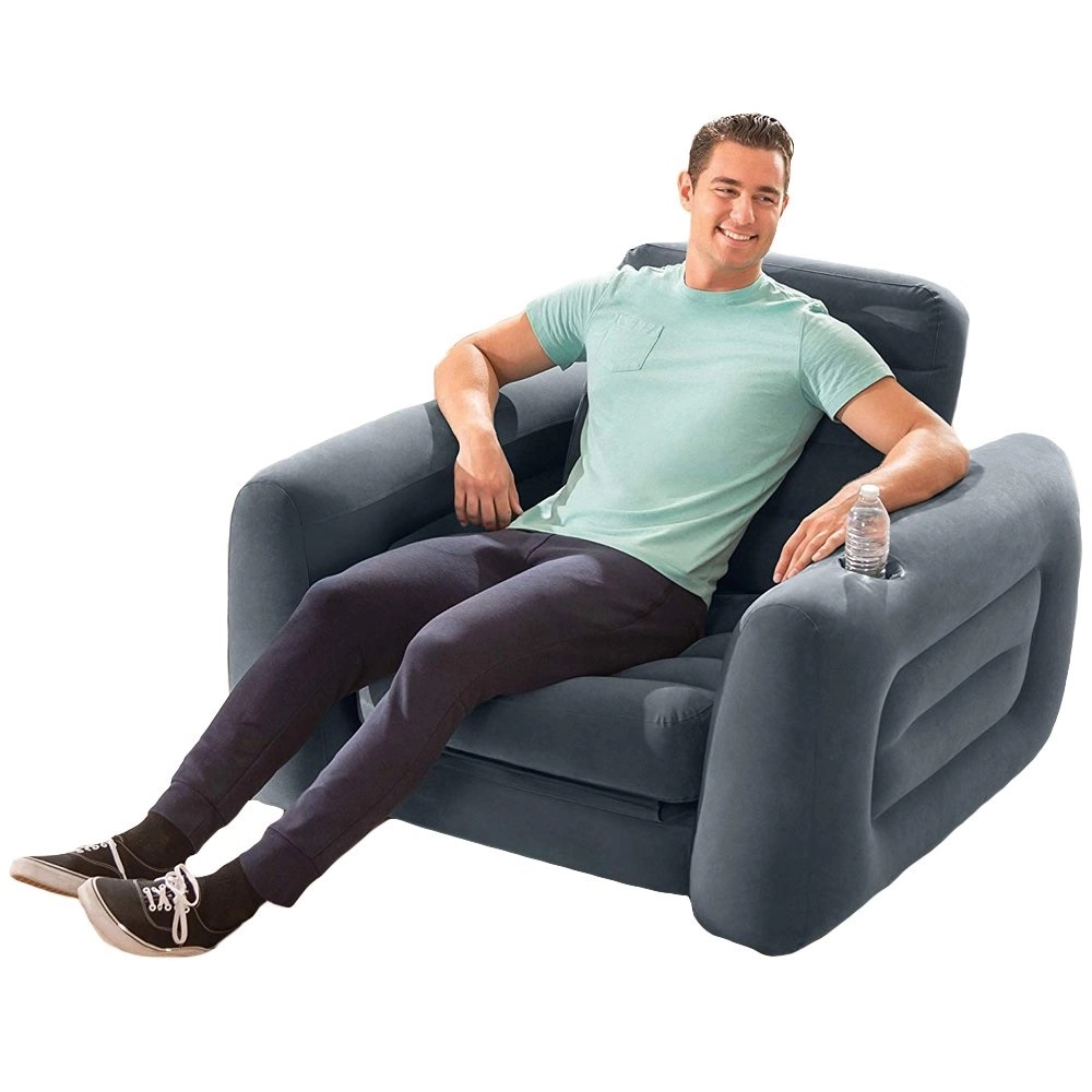 Den komfortable og kompakte oppustelige stol tilbyder en behagelig siddeoplevelse med en indbygget kopholder i armlænet. Perfekt til afslapning efter en lang dag.