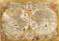 Puslespillet præsenterer et komplekst og æstetisk smukt design af et gammelt verdenskort, ideelt for elskere af kartografi.