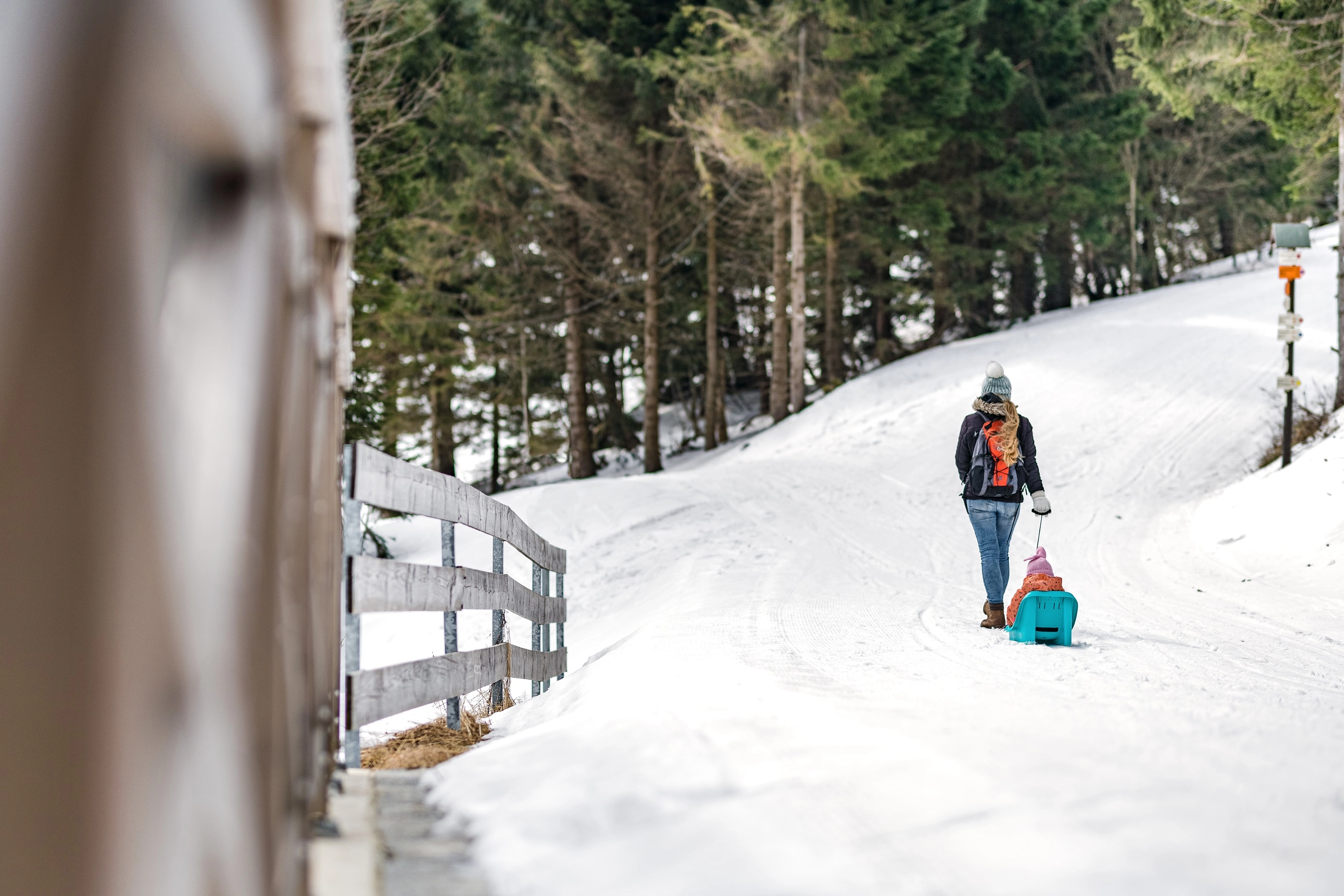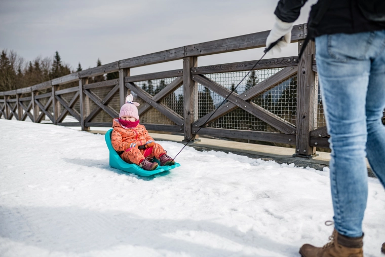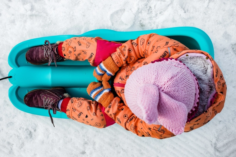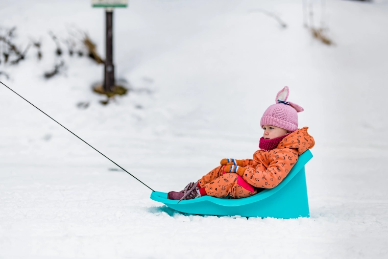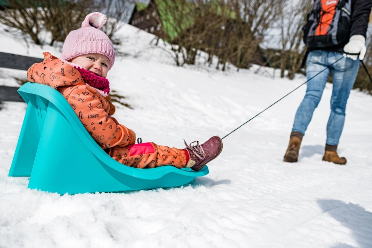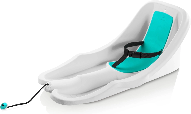 Den praktiske størrelse og lave vægt gør den nem at håndtere og bære. Dobbelte meder sikrer stabilitet på sneen og en jævn glideevne. Ideel til de første kælketure og til komfortabel trækning på vinterstier eller pister.