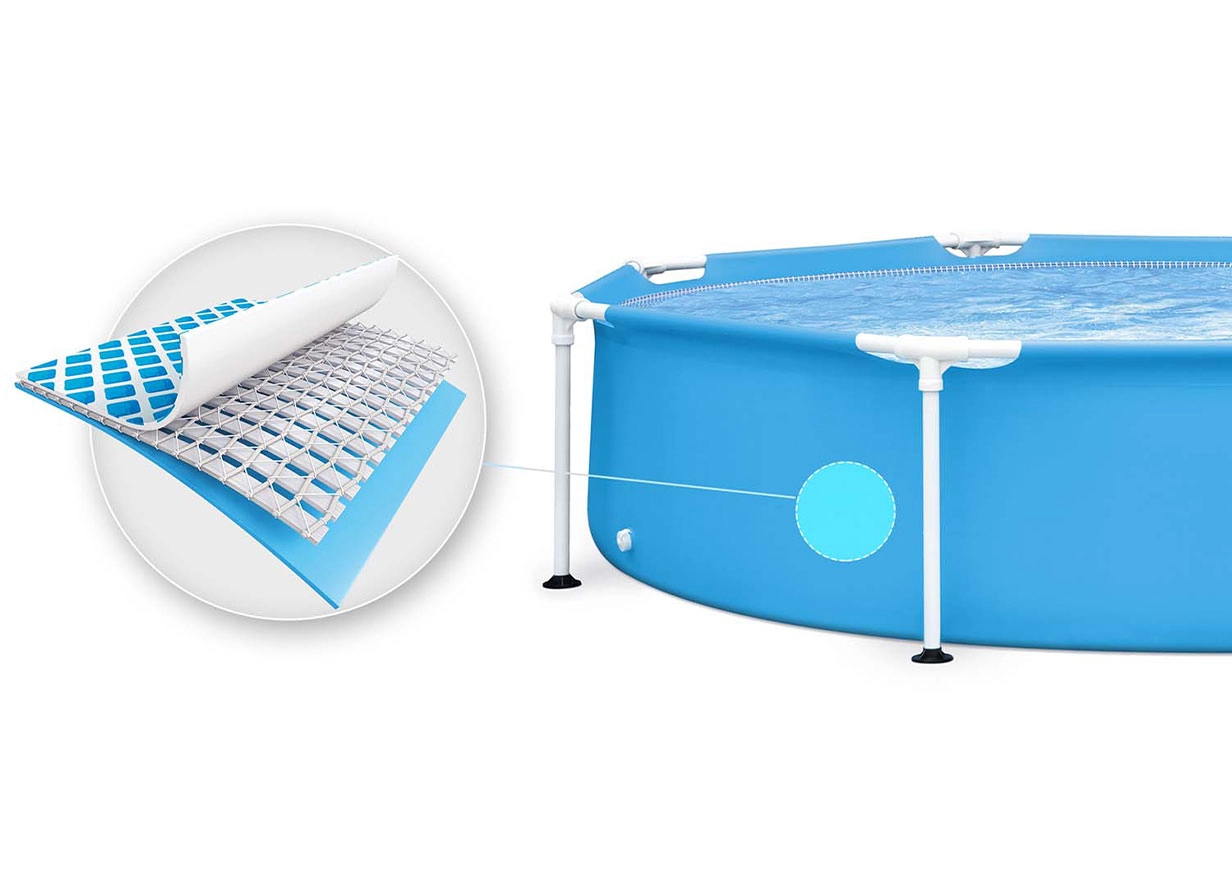 Forstærkningen af nylonnet i midten af væggene sikrer lang levetid og modstandsdygtighed mod rifter og vejrpåvirkninger. Den praktiske aftapningsventil gør vedligeholdelsen lettere, og tilslutning af en filterpumpe (medfølger ikke) hjælper med at holde vandet rent.