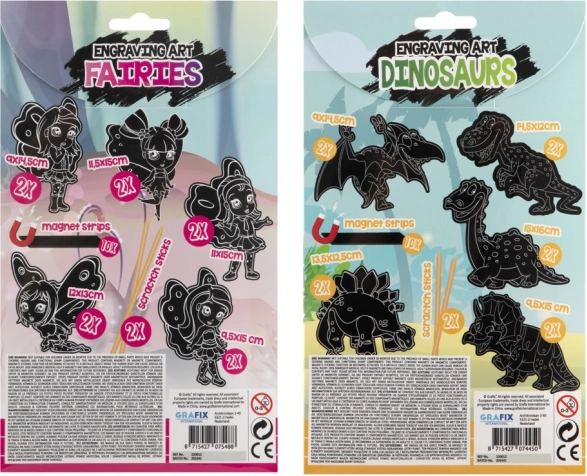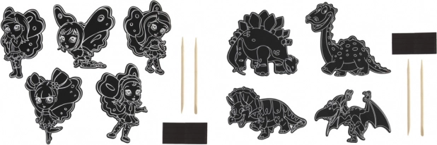Kreativt sæt med skrabbe-magneter med motiver af feer og dinosaurer. 10 magneter + 2 skrabepinde. Ideelt til køleskab og andre metaloverflader.