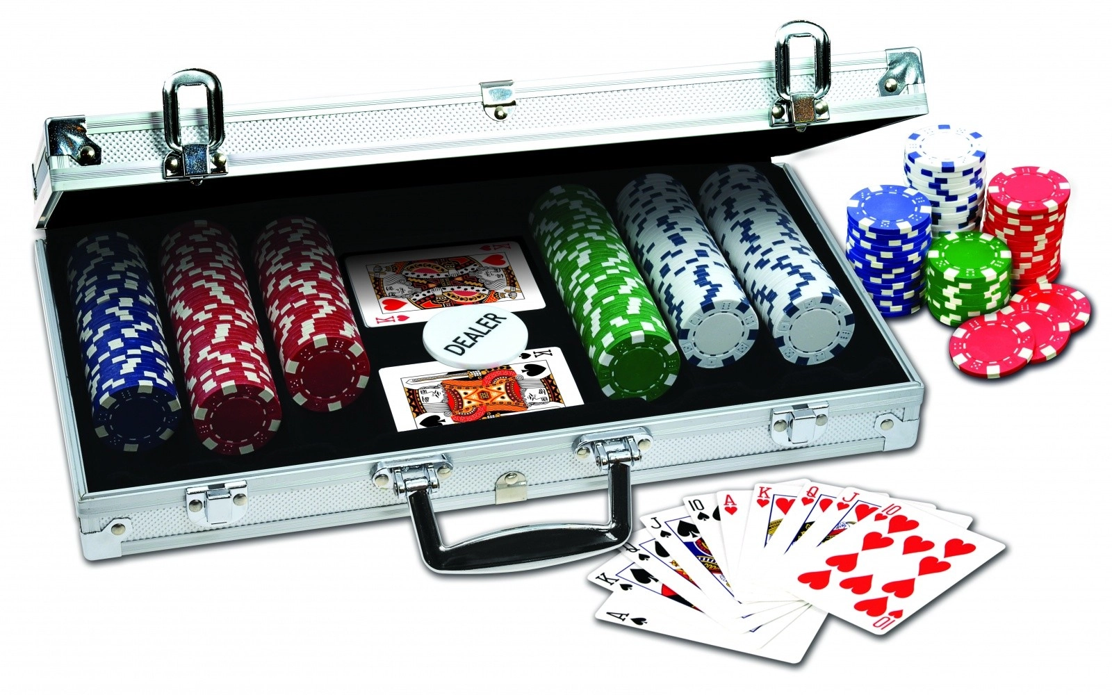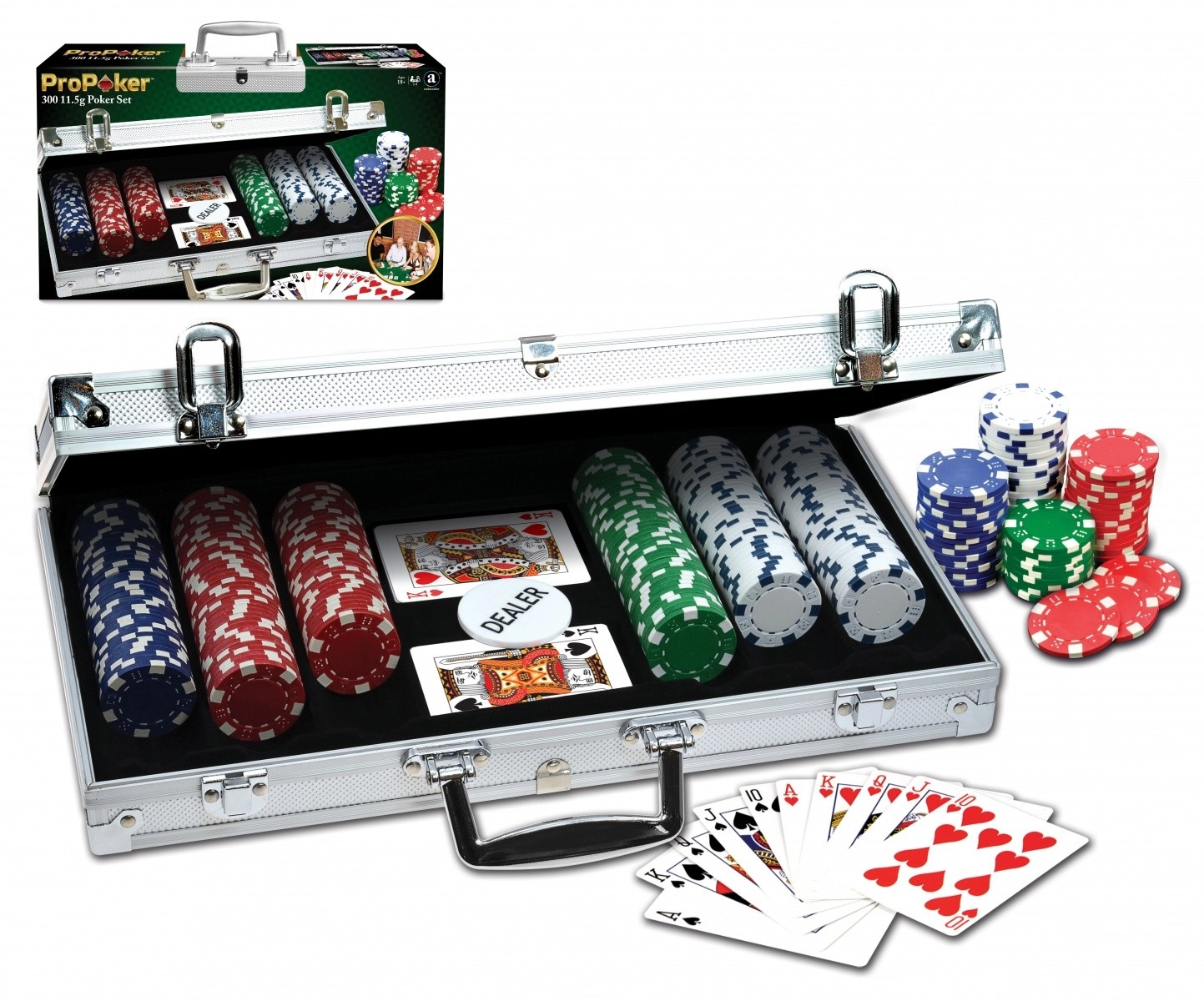 Komplet pokersæt i en elegant aluminiumskuffert til hjemmeturneringer og hygge med venner. Indeholder 300 kvalitetsjetoner med en vægt på 11,5 g i 4 farver med terningesymboler – ideelt til en autentisk spilleoplevelse.