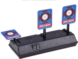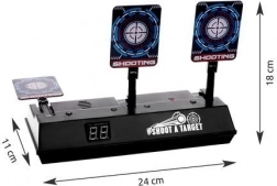 Skiven kan bruges med skumdartpistoler og giver en autentisk oplevelse med lyd- og lyseffekter. Når du rammer målet, hører du lyden af knust glas eller applaus. Skiven er udstyret med en digital tæller, som registrerer point. Den nulstilles automatisk, når alle tre mål er ramt.