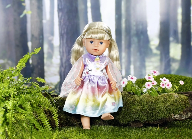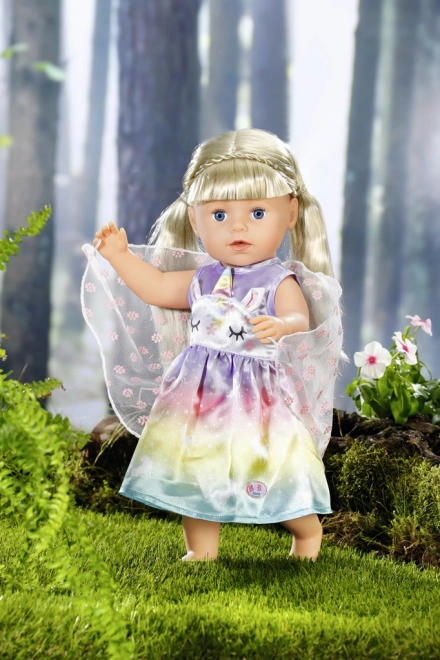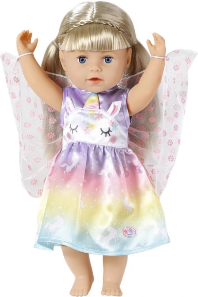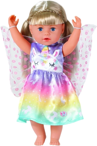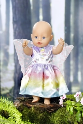 Feer og enhjørninger hører sammen ligesom mælk og småkager. Fe-kjolen til BABY born-dukken er syet af et smukt regnbuefarvet stof. Nederdelen er printet med magiske enhjørninger, der danser på stjernehimlen. Den øverste del af kjolen er foran pyntet med et enhjørningsansigt med påsyede ører og et farverigt horn. En rigtig fe skal selvfølgelig også have vinger. De gennemsigtige vinger med glitrende blomster er syet ind i den bageste del af kjolen, og så snart BABY born stikker hånden gennem den lille løkke øverst på vingerne, folder de sig ud. Originalt tøj til BABY born-dukker. Til fantasifuld, varieret og langvarig leg. BABY born Eventyrkostume Enhjørning til dukker i størrelsen 43 cm. Bøjle medfølger.