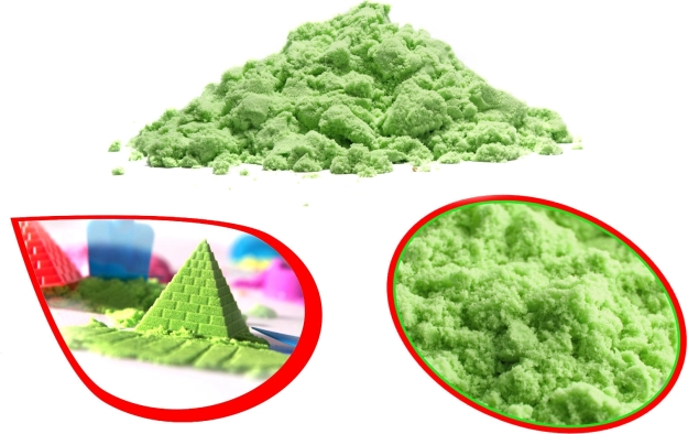 Dette grønne kinetiske sand rinder behageligt mellem fingrene, men bliver formbart og elastisk ved æltning. Børn kan lave figurer, former og sandslotte og samtidig træne koncentration og fingerfærdighed. Ideelt til sensoriske lege og beroligende aktiviteter.
