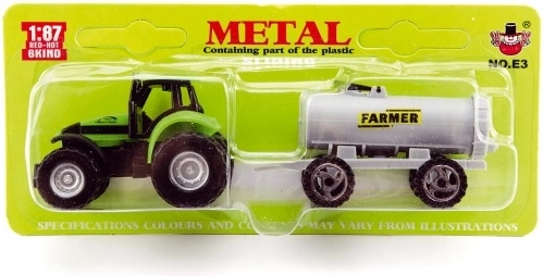 Model af traktoren med store sorte dæk og grå tankmærket 'FARMER'.