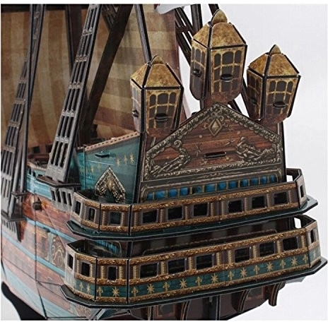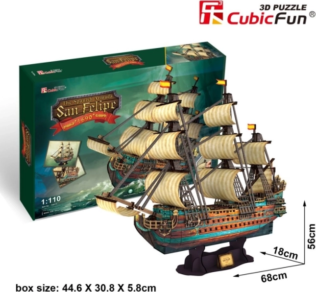 3D-puslespillet San Felipe fra CubicFun bringer en realistisk model af en historisk galeon med rige udsmykninger og gennemtænkte dæksdetaljer. Brikker af ca. 3 mm skum belagt med lamineret, trykt papir passer præcist sammen og muliggør et stabilt og attraktivt resultat uden brug af lim eller saks.