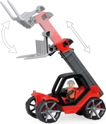 Denne teleskopiske læssemaskine er fremstillet af plast i høj kvalitet og tilbyder en solid konstruktion, der tåler intensiv leg. Takket være de gummibelagte hjul med stille gang er den også ideel til leg indendørs. Med den opklappelige kabine og den aktive figur kan børnene nemt forestille sig, at de er rigtige operatører af et bygge køretøj.