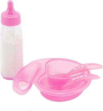 Dette dukkesæt er den ideelle tilføjelse til enhver lille plejerske. Forbered lækre måltider i skålen og server dem til din dukke med den medfølgende ske og gaffel. Observer, hvordan mælken i flasken 'fordamper', når du giver dukken en drink, og dukker op igen, når du vender flasken. Dette sæt bringer timevis af sjov og fremmer udviklingen af finmotorik og omsorg for andre.
