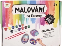 12 sten (6 der lyser i mørke), 6× glitterlim, 12× farver i genlukkelige bægre, klistermærker, paletter til farveblanding, pensler, bevægelsesøjne, holdere til stenmaling