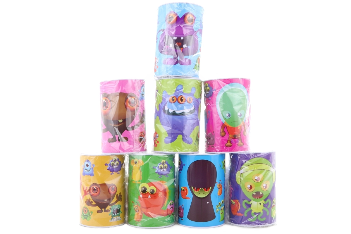 Metaldåse-sparebøsse med monstermotiv, ca. 15 x 10 cm. Pakket i pose. Sparebøssen kan ikke åbnes. Alder 3+.