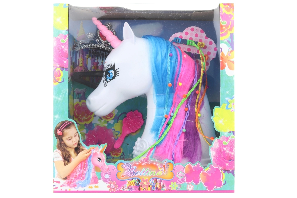 Børstehoved af en enhjørning med mål ca. 22 x 27 cm. Pakken indeholder en kam, en krone og 6 farvede fletninger. Pakkens mål er ca. 30,5 x 32 x 14 cm. Alder 3+