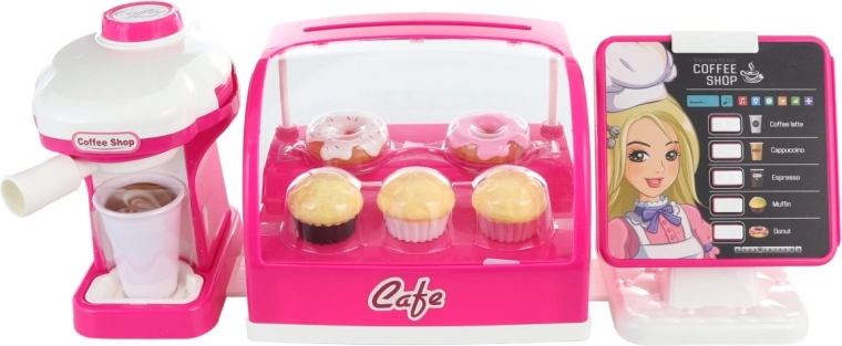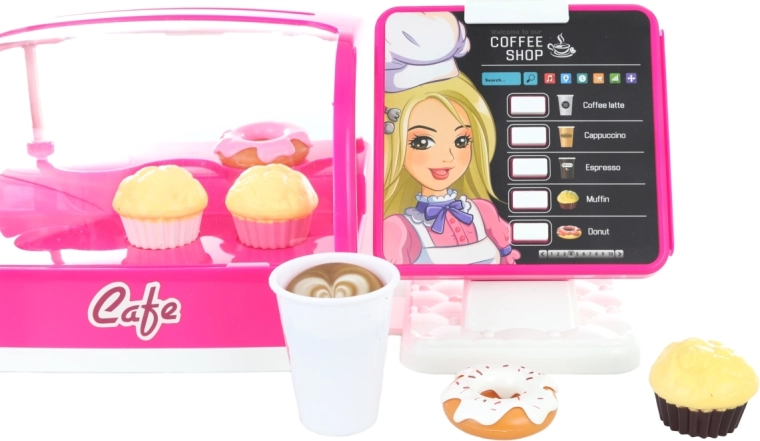 Nyd sjov med stort børnecafé-legetøj, der tilbyder kaffemaskine, køleskab med kager og kasseapparat, alt på batterier.