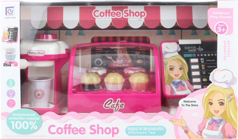 Oplev glæden ved leg med vores børnecafé på batterier, som er perfekt til små baristaer. Dette legesæt indeholder alt, hvad du har brug for: kaffemaskine, køleskab med kager og kasseapparat.