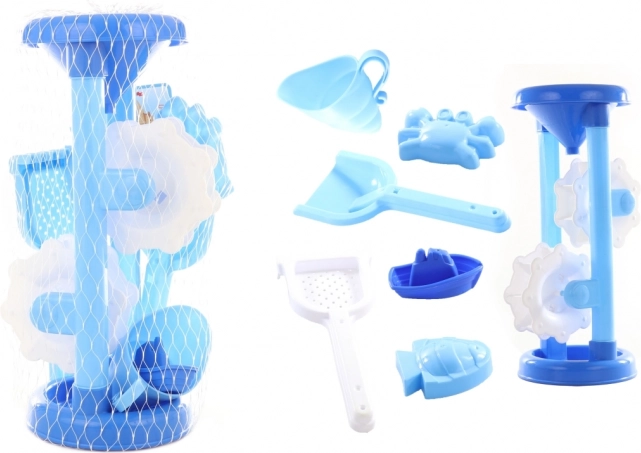 Denne blå sand- og vandkværn glæder alle små fans af strand- og havelege. Hæld blot vand eller fint sand i tragten, så begynder skovlene at dreje, hvilket giver masser af sjov og hjælper med at udvikle finmotorik og fantasi.