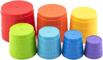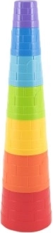 Denne farverige stabelpyramide giver børn masser af sjov og læring på én gang. Syv plastkopper i forskellige størrelser kan nemt bygges til et højt tårn eller stables ind i hinanden – det træner logik, tålmodighed og finmotorik.