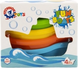 Sættet indeholder fire både i klare farver – blå, orange, grøn og gul – som nemt kan stables for enkel opbevaring. Formen og farverne stimulerer børns fantasi og kreativitet under vandlegen.