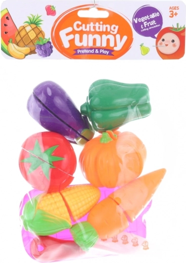 Sjovt plastiksæt med grøntsager til skæring for små kokke. De enkelte stykker er indeni forbundet med velcro, så de kan skæres og samles igen og igen. En fantastisk leg til udvikling af finmotorik og til at lære om madvarer. Pakken indeholder i alt 14 dele.