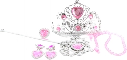 Denne pakke indeholder en krone pyntet med rosa hjerter, øreringe, halskæde og ring, som din lille adelsdame vil sætte pris på.